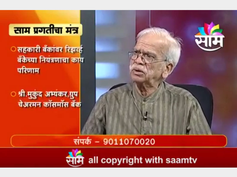 SAAM TV वरील ‘साम प्रगतीचा मंत्र’ या कार्यक्रमात ‘सहकारी बँकांवर रिझर्व्ह बँकेच्या नियंत्रणाचा काय परिणाम होईल’ या विषयावर कॉसमॉस बँकेचे ग्रुप चेअरमन डॉ. मुकुंद अभ्यंकर यांनी मार्गदर्शन केले. ही मुलाखत जरूर पहा. <br /><br /><br /> <iframe src="https://www.youtube.com/embed/bGzlibLtEl0" allow="accelerometer; autoplay; encrypted-media; gyroscope; picture-in-picture" allowfullscreen="" width="560" height="315" frameborder="0"></iframe>