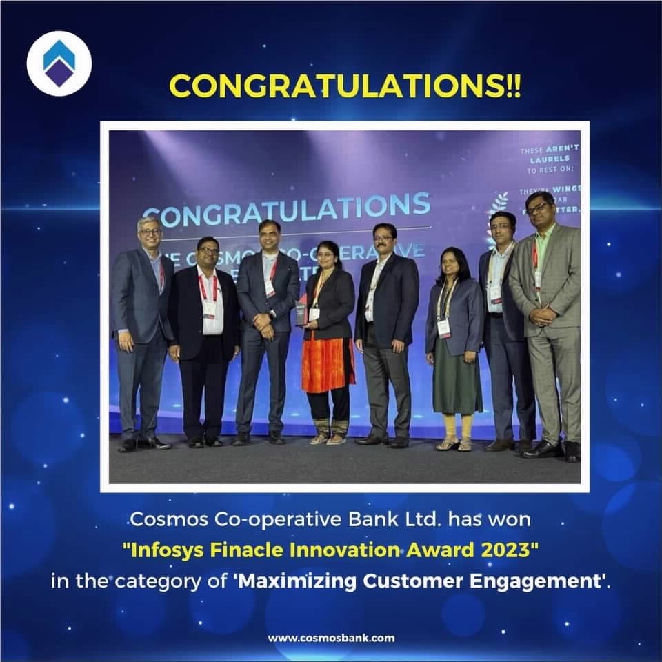 With immense pleasure we inform that Cosmos Bank has won the prestigious Infosys Finacle Innovation Award 2023 in the category of "Maximising Customer Engagement". Cosmos Bank is the only bank in the co-operative sector to win the award. It is indeed a proud moment for us all.