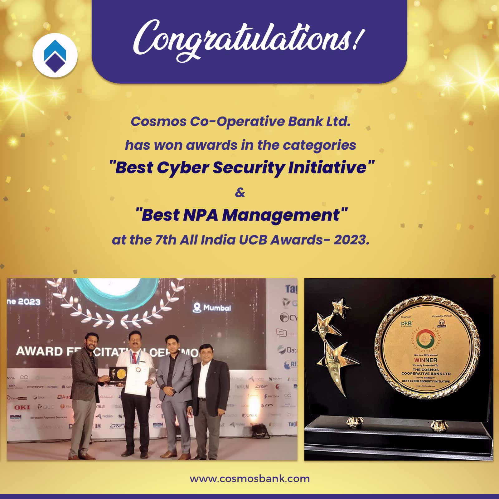 We are glad to inform you that our Bank has bagged the 7th All India UCB Awards- 2023 in the categories *"Best Cyber Security Initiative" and "Best NPA Management"* during 7th All India UCBs Summit and Award ceremony held today at Mumbai.