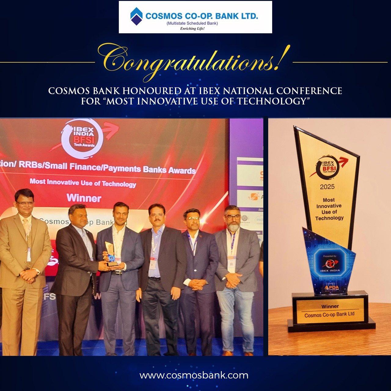 A proud moment for Cosmos Bank! The Bank was honoured with “Most Innovative Use of Technology” award at the prestigious IBEX National Conference. Director Arvind Tavare and Chief Information Technology Officer (CITO), Rajendra Godbole proudly accepted the award on behalf of the entire Cosmos Bank family.