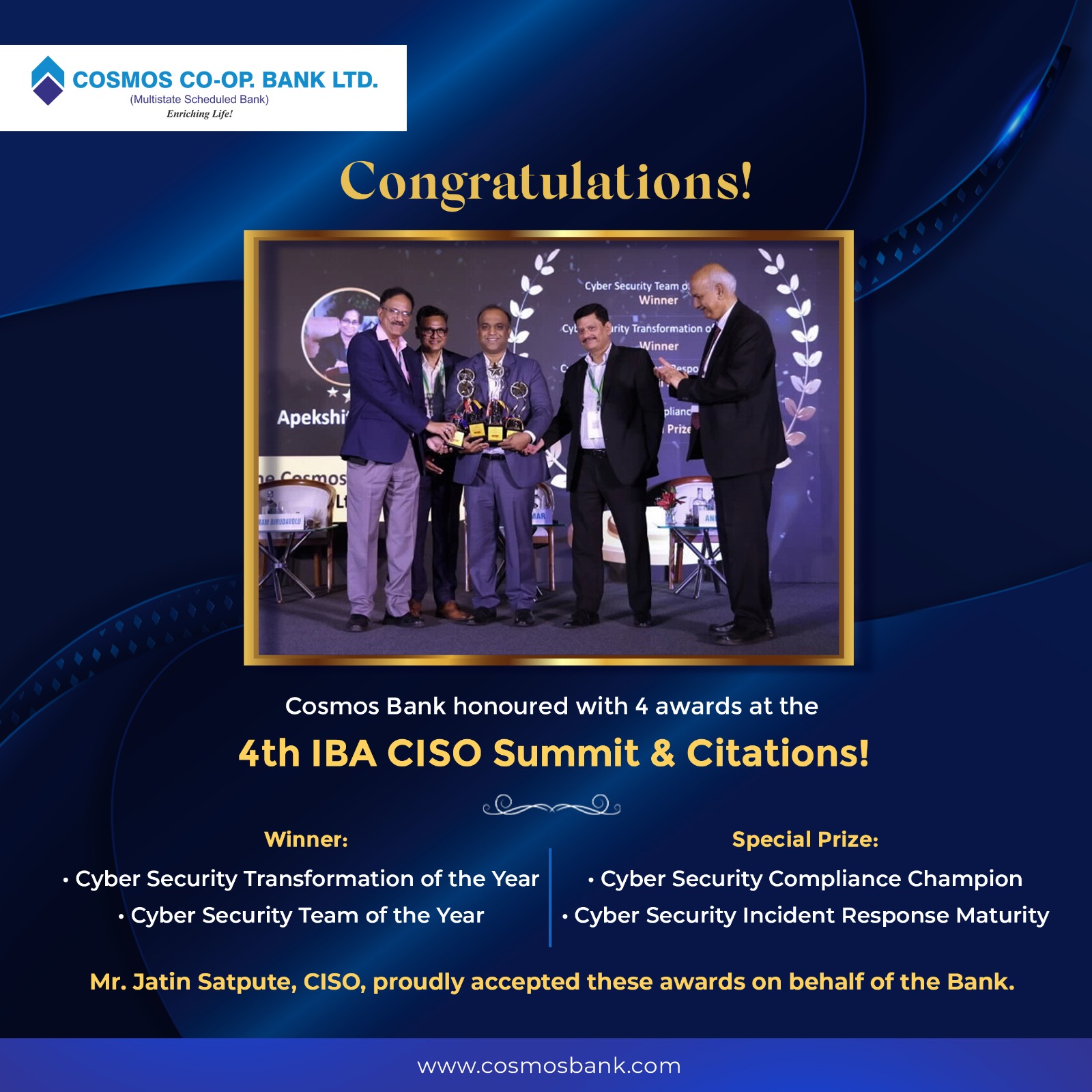 A moment of pride for Cosmos Co-op Bank at the 4th IBA CISO Summit & Citations. Our Chief Information Security Officer, Mr. Jatin Satpute, proudly accepted four prestigious awards. This honour recognises our excellence in cybersecurity. <br /> Dr. Sriram Birudavolu (CEO, Cyber Security Centre of Excellence at DSCI), Mr. Pravin Kumar (Chief Market Information Security Officer and DPO at NPCI), Mr. Anil Bhandari (Ex Chief General Manager and Group CISO at SBI and Advisor, National Critical Information Infrastructure Protection Centre), and Mr. Gopal Murli Bhagat (Deputy Chief Executive – Indian Banks Association) were present at the event.