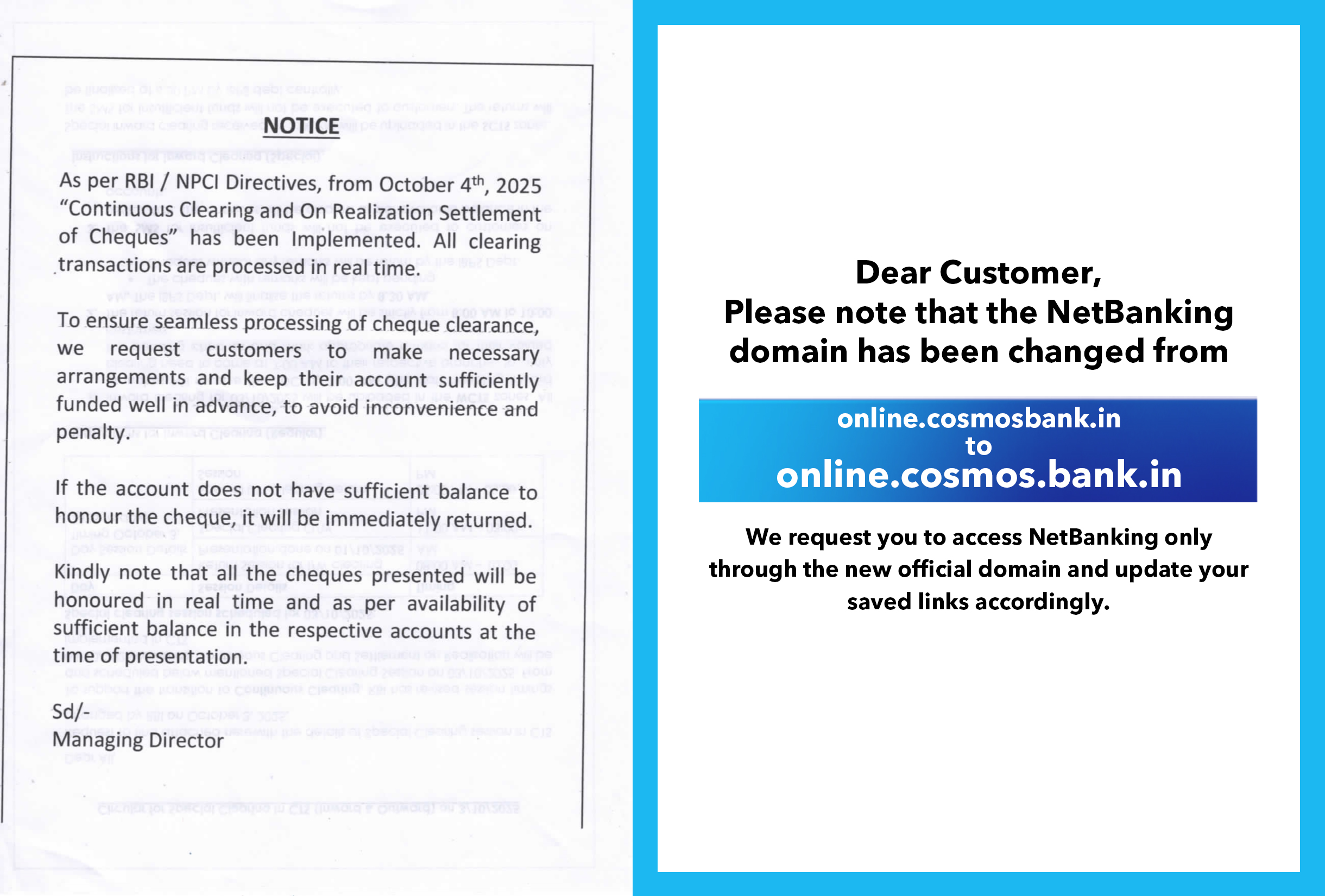 At Cosmos Bank, we are committed to helping you meet all your banking needs to the best of our ability. You can access internet banking portal of our website at any hour of the day. There are no fixed timings to use the facilities. Moreover, enjoy the luxury of getting all the work accomplished at the comfort of your home or office, at any hour that is preferable for you