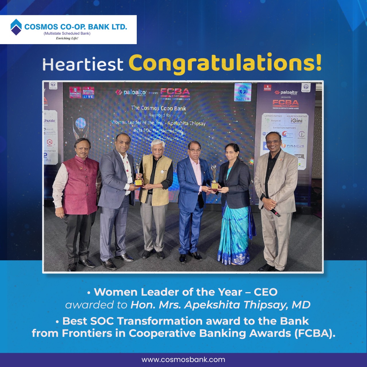 Cosmos Bank wins Best SOC Transformation Award | Hon. MD, Mrs. Apekshita Thipsay honoured with Women Leader of the Year – CEO award