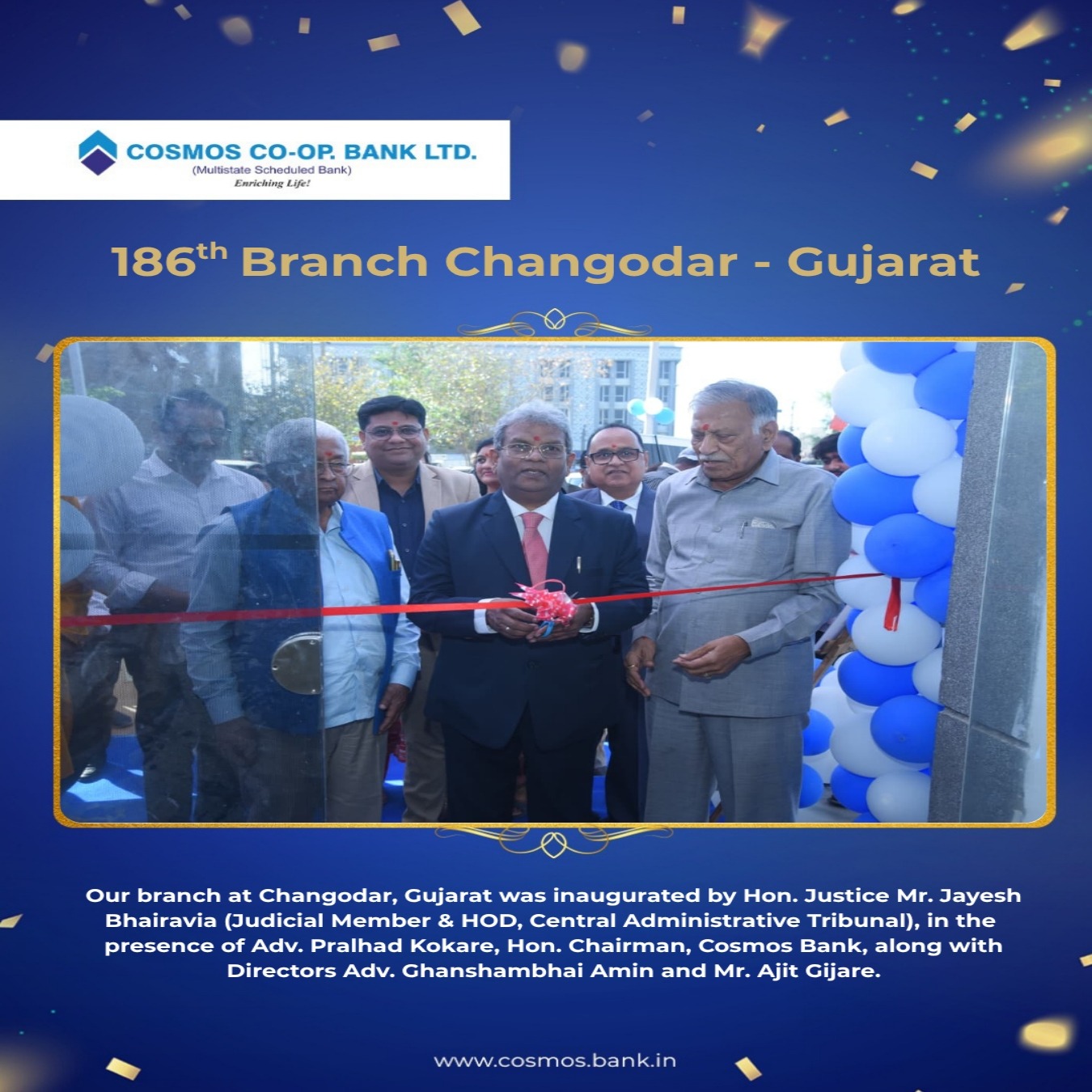 We are pleased to announce the inauguration of our Changodar Branch, Gujarat, at the auspicious hands of Hon. Justice Mr. Jayesh Bhairavia (Judicial Member & HOD, Central Administrative Tribunal). Adv. Pralhad Kokare, Hon. Chairman, Cosmos Bank, along with Directors Adv. Ghanshambhai Amin and Mr. Ajit Gijare were also present on the occasion. The pooja at the inauguration was performed by Director, Adv. Ghanshambhai Amin. This inauguration marks an important addition to our growing presence in the state.