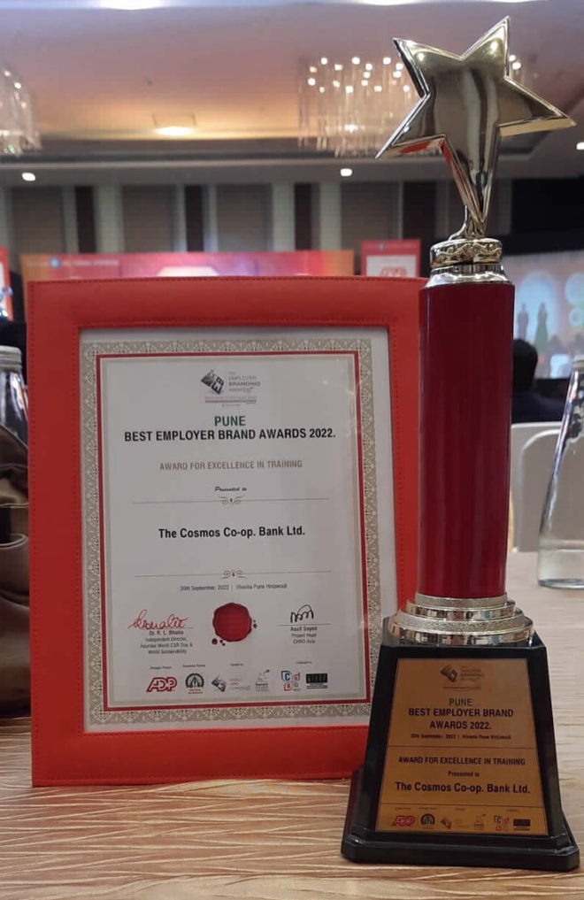 Bank has received Pune Best Employer Brand Awards 2022 in the category of “Excellence in Training”. The Award was received on behalf of the Bank by Mr. Avinash Chavan HRD Head & General Manager - Operations, and Ms. Geeta Datar, Deputy General Manager – HR & Training.
