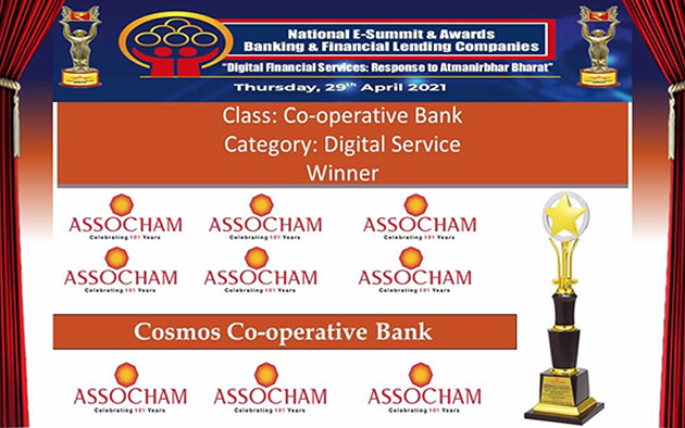 Bank is declared winner under the ‘Digital Services with the Cooperative Bank Category’ by Associated Chambers of Commerce and Industry of India (ASSOCHAM). <br /> The award was presented to Cosmos Bank during the ASSOCHAM National E-Summit & Awards Banking & Financial Lending Companies “Digital Financial Services: Response To Atmanirbhar Bharat” today, i.e. Thursday, 29th April 2021.